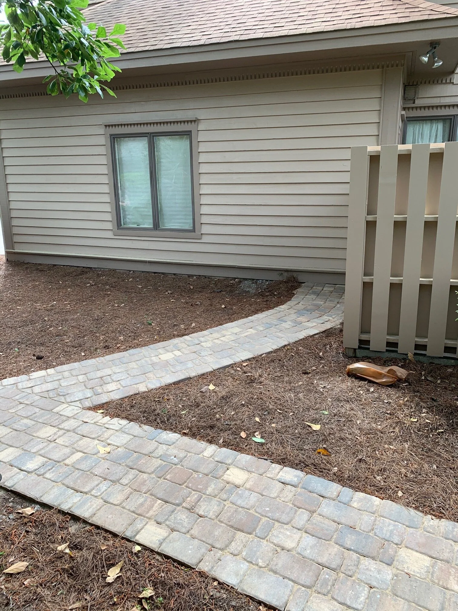 Pavers — Built 115' walkway, fire pit lounge area with fire pit, service yard paver patio